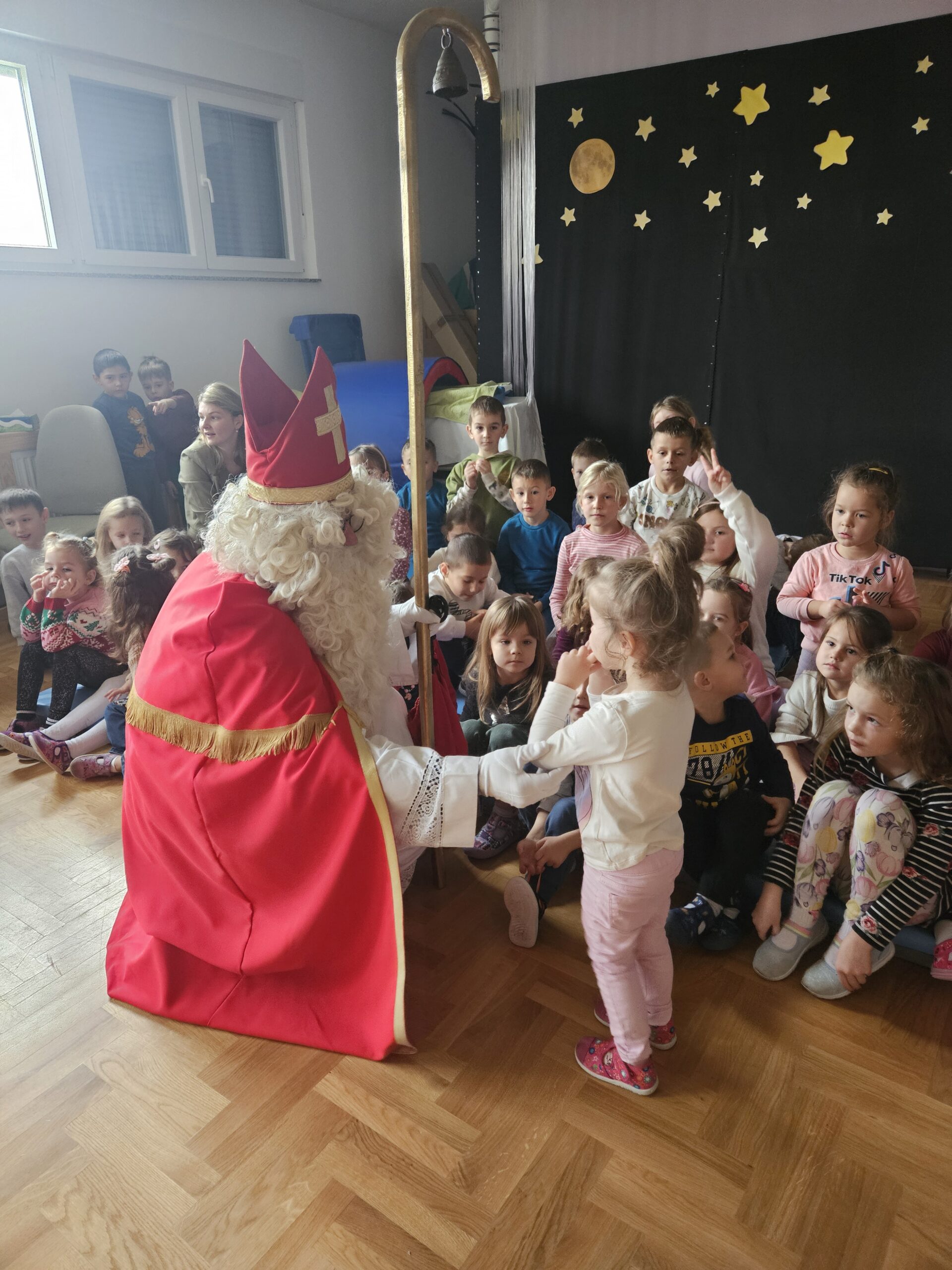 Danas je naš vrtić ispunila posebna radost, posjetio nas je dragi Sveti Nikola. Djeca su ga dočekala s osmijehom i pjesmom, pjevajući svoje omiljene nikolinske pjesmice koje su Nikoli posebno razveselile srce. Sveti Nikola je s djecom razgovarao o dobroti, lijepom ponašanju i međusobnom pomaganju. Mališani su mu ponosno pričali o svojim dobrim djelima, a on ih je strpljivo slušao i poticao da i dalje budu pažljivi, iskreni i dobri prijatelji jedni drugima. Nakon razgovora, Sveti Nikola je svakom djetetu uručio mali poklon koji je unio još više veselja u njihova lica. Završili smo druženje zajedničkim fotografiranjem kako bismo sačuvali lijepu uspomenu na ovaj poseban dan. U našem vrtiću danas je vladala toplina, smijeh i čarolija, baš onakva kakvu donosi Sveti Nikola!