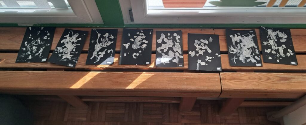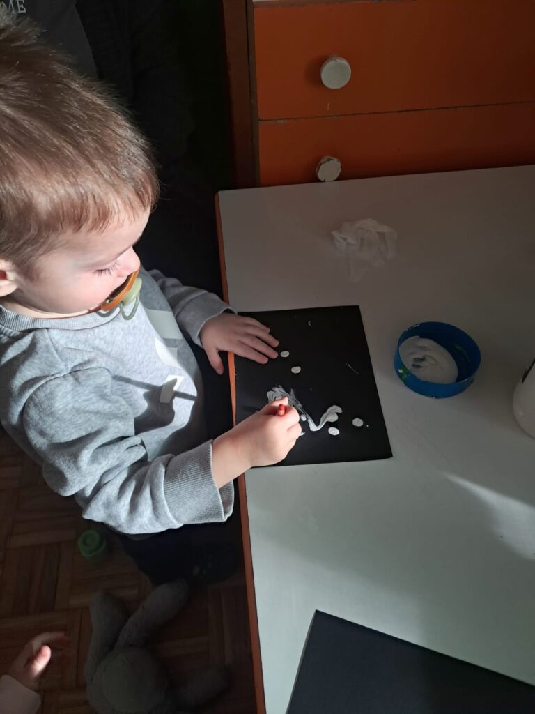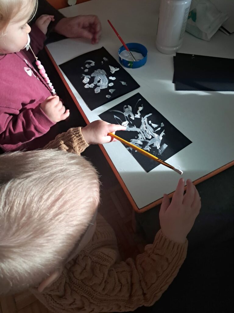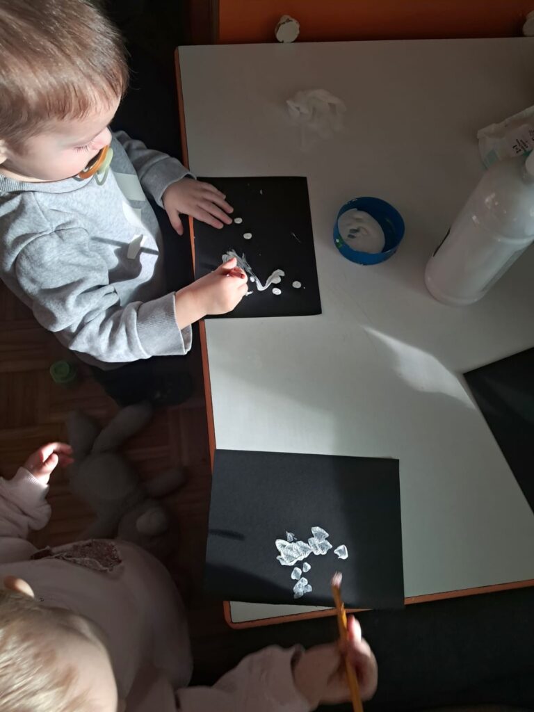 Jaslična skupina Sovice uživala je u zimskim likovnim aktivnostima. Mališani su temperama stvarali svoje prve zimske pahuljice, istražujući boje i nove slikarske tehnike. Kroz igru, dodir i kreativno izražavanje razvijali su maštu i finu motoriku, a crni papir pretvorili su u pravo malo zimsko čudo. Aktivnost je protekla u ugodnoj i poticajnoj atmosferi, ispunjenoj dječjom radošću i kreativnim stvaranjem.