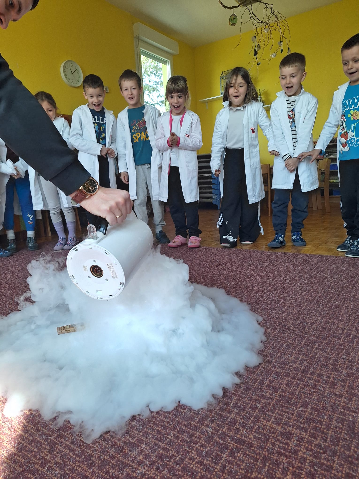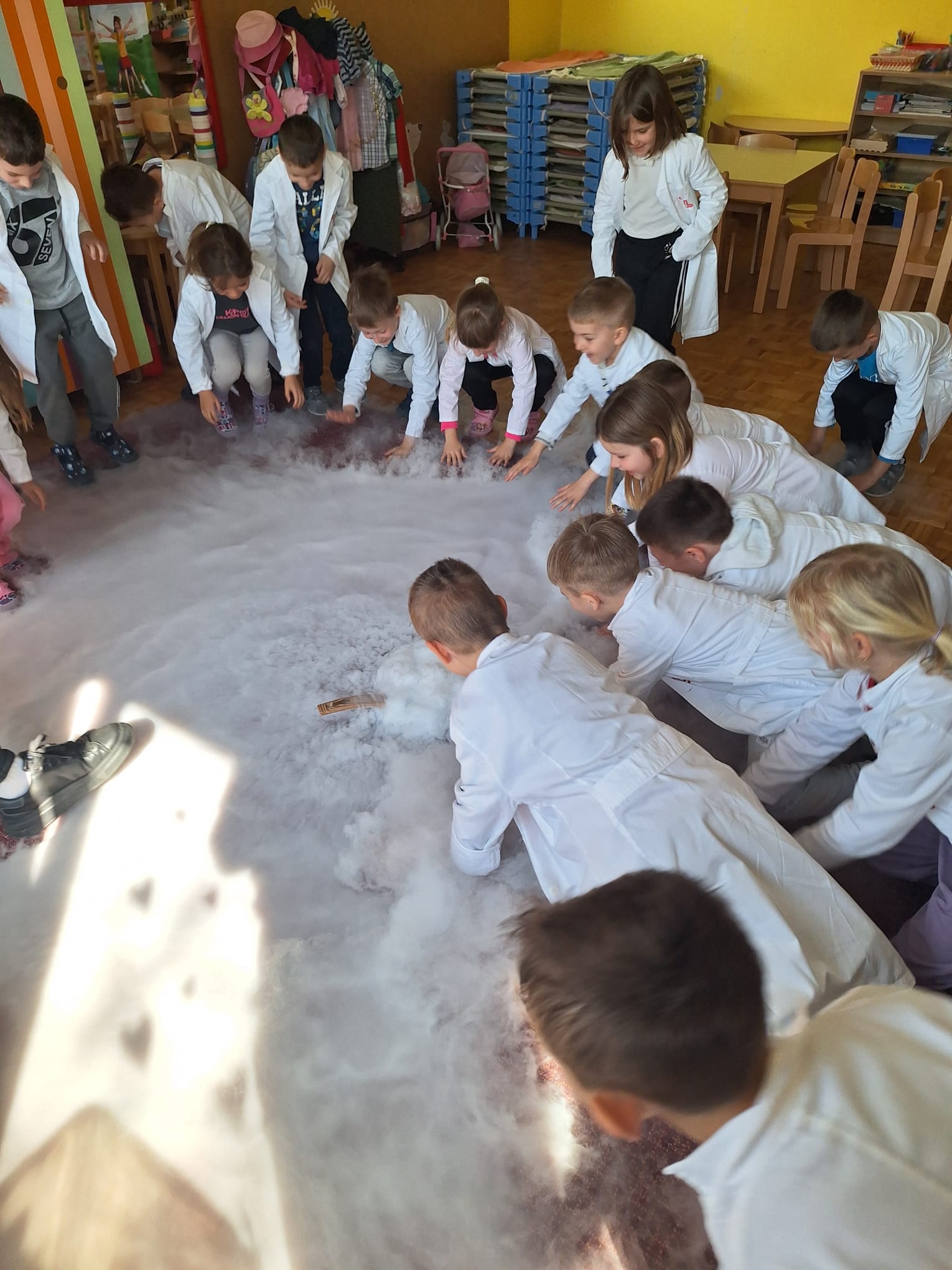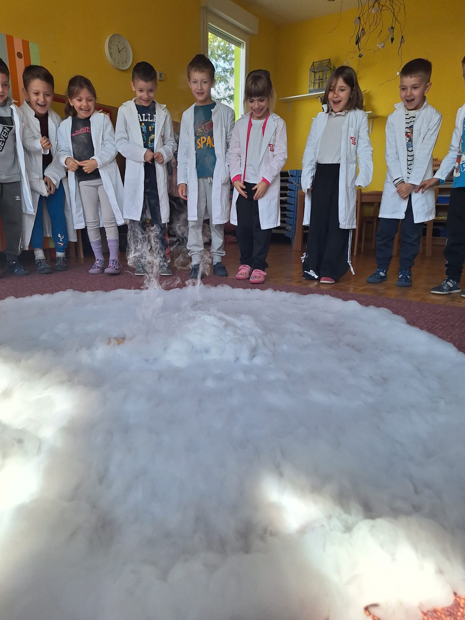 U današnjoj radionici djeca su učila o kruženju vode u prirodi te agregatnim stanjima vode. Izvodili su pokus prijelaza ugljičnog dioksida u plinovito stanje koji im se jako svidio, nisu skrivali oduševljenje.