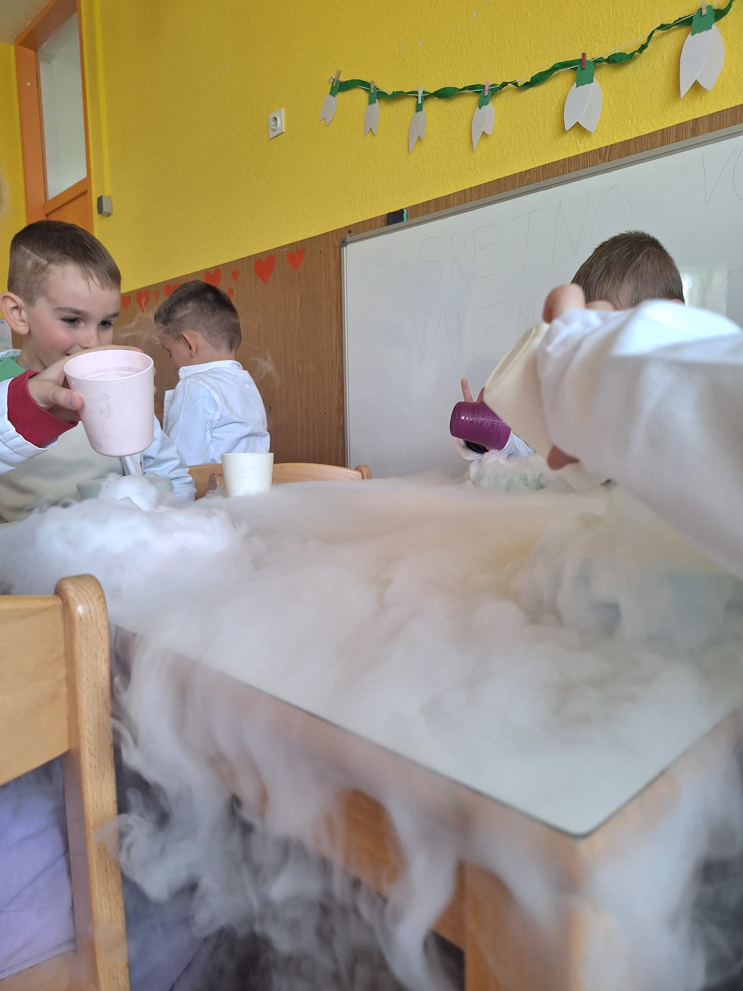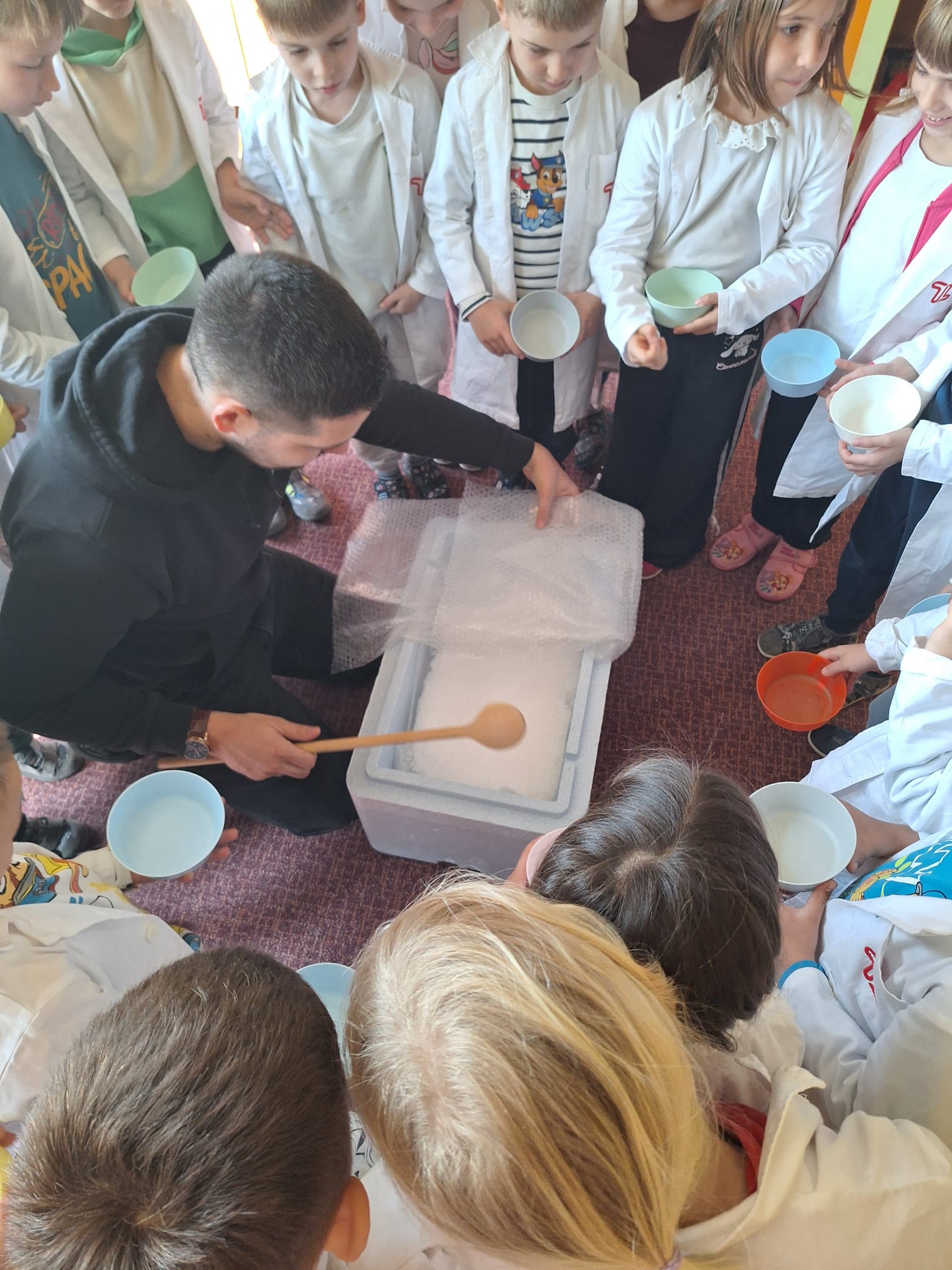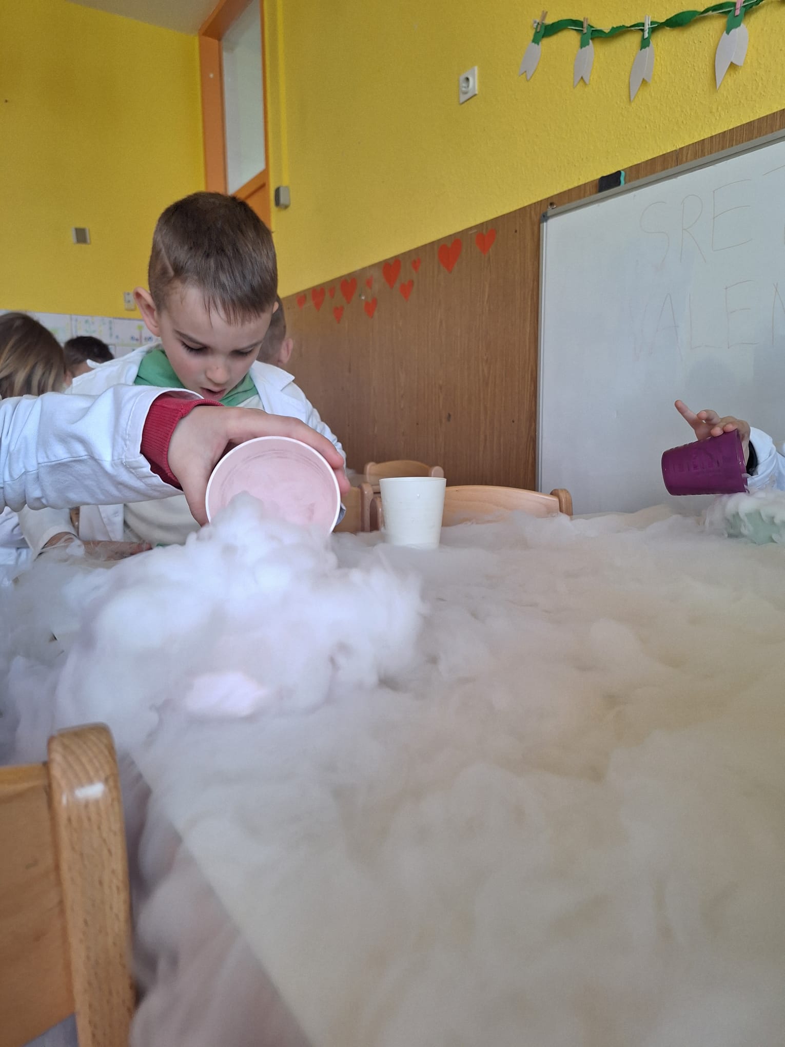 U današnjoj radionici djeca su učila o kruženju vode u prirodi te agregatnim stanjima vode. Izvodili su pokus prijelaza ugljičnog dioksida u plinovito stanje koji im se jako svidio, nisu skrivali oduševljenje.