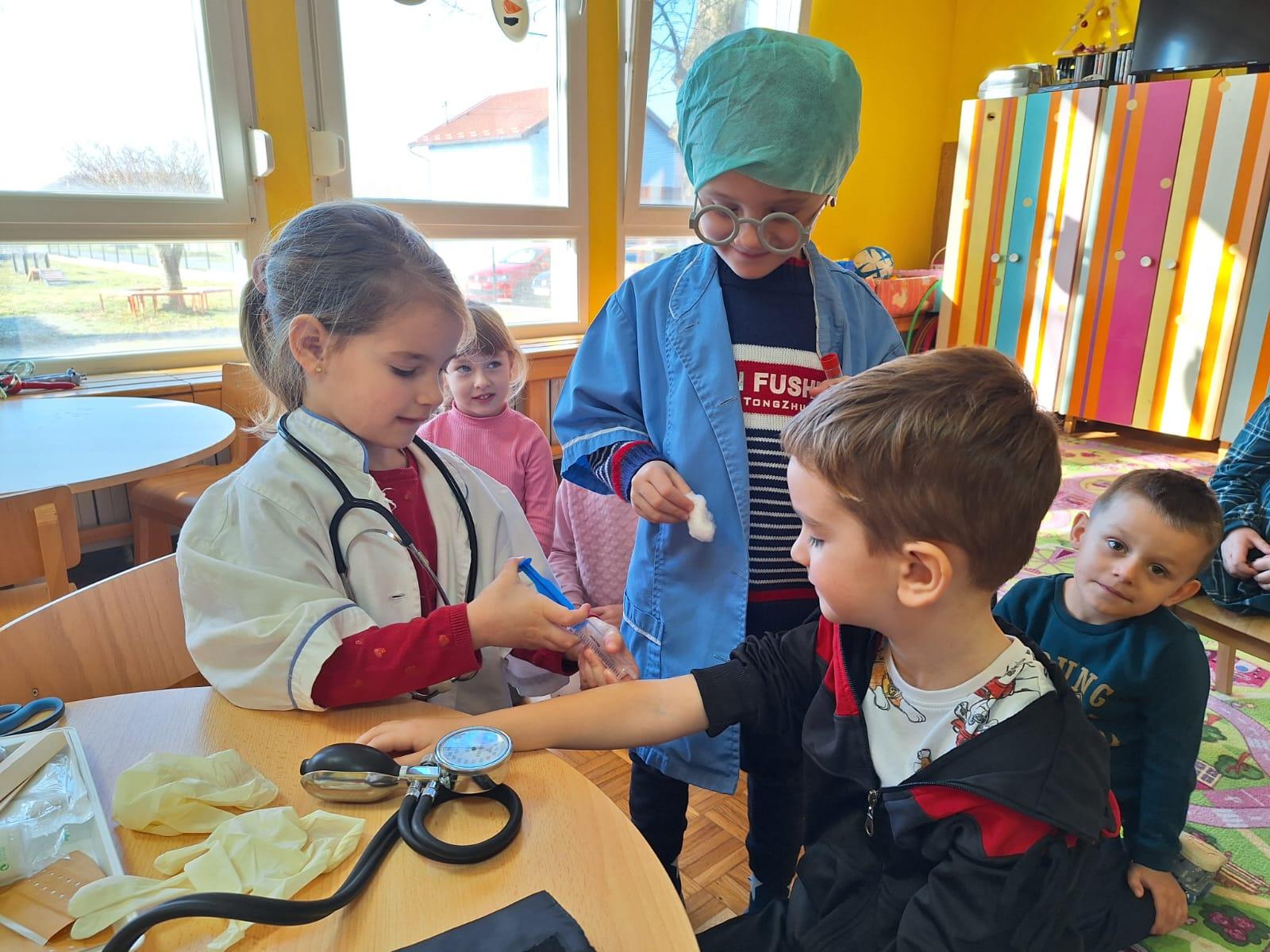 Skupina “Ivančice” su za ovotjednu temu imali: “Odlazak kod liječnika”. Zbog sezona prehlada i gripe, djeca su u zadnje vrijeme često posjećivala liječnika. Zapazili smo da se nekolicina djece plaši odlaska liječniku. Odlučili smo obraditi ovu temu kako bismo djeci objasnili da se liječnika ne treba bojati. Upoznali smo se s važnosti održavanja osobne higijene, raznolike prehrane, tjelesne aktivnosti i boravka na zraku u održavanju našeg zdravlja. Djeca su se također, kroz simboličku igru, upoznala s liječničkim alatima. Od životno-praktičnih aktivnosti smo radili na razvijanju samostalnosti u posluživanju obroka i odijevanju. Ostajte nam zdravi! Odgojiteljica Mija Vinković